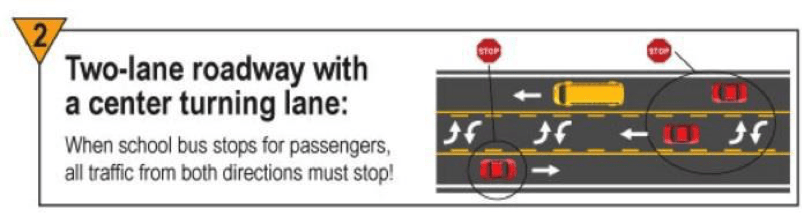 Example 2 is a two-lane road with a middle turn lane. In this road condition, like a standard two-lane road, it is illegal to pass a stopped school bus from any direction. Many motorists that pass a stopped school bus heading the opposite direction are not aware of the law in this scenario. There is not a great deal of data on how many stops and violations take place on this road condition, but data suggest from earlier years that <27% of violations happen on roadways that are over two lanes.