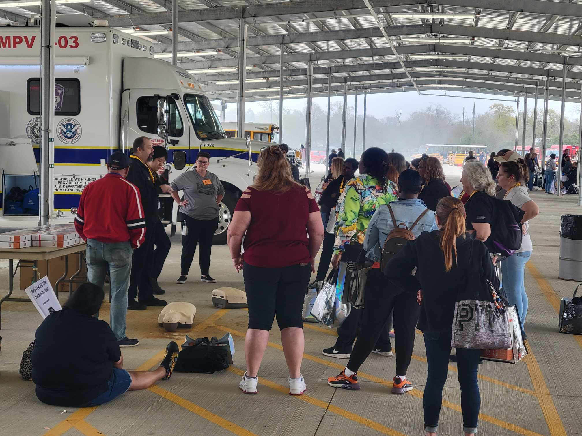 In addition to loading and unloading students from a school bus, local EMS experts showed attendees how to perform CPR chest compressions, including how hard thrusts should be, how to feel for a heartbeat and basic lifesaving tips.